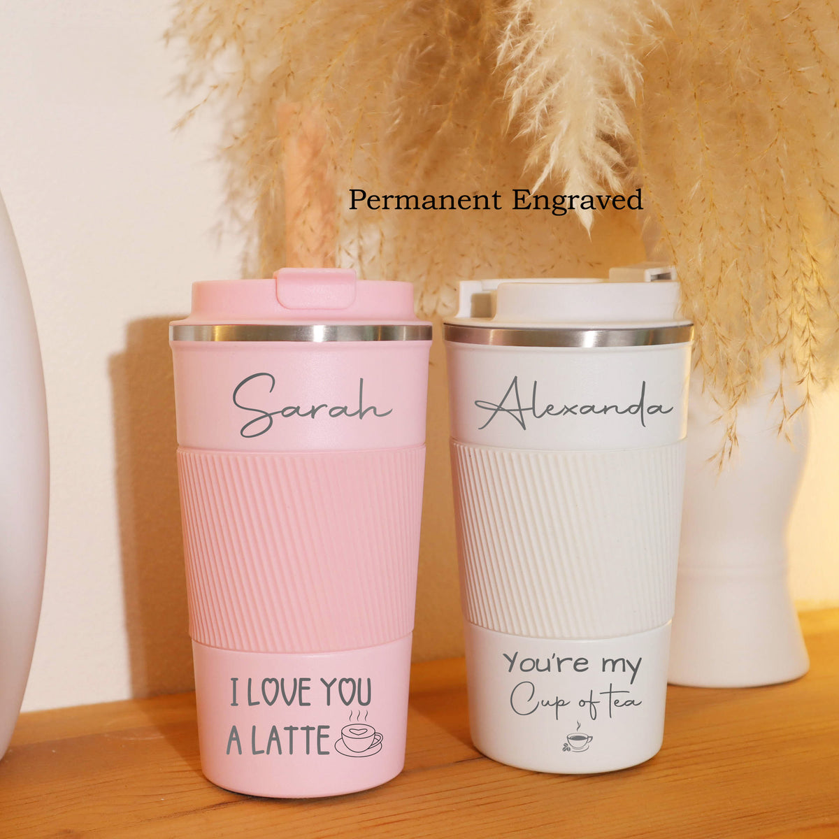 Personalized Valentine coffee cup is a prefect gift for loved one. It is reusable mug. These are not vinyl, this is a permanent engraving! The engraving process removes the paint from metal revealing the brushed stainless steel beneath.
